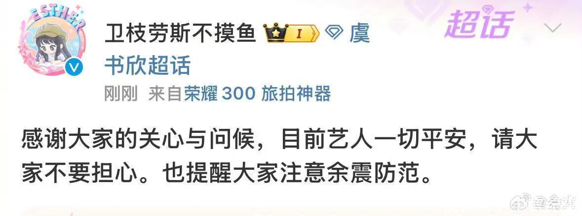 3月28日,知名艺人虞书欣工作室发文:“感谢大家的关心与问候,目前艺人一切平安,请大家不要担心。也提醒大家注意余震防范。”随后,虞书欣方发文报平安也是迅速登上热搜第一。